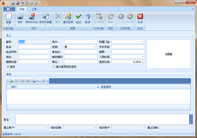 2. 點擊工具欄的“新建”按鈕,會彈出新建員工窗口,填寫員工相關(guān)的信息和員工的登錄用戶名即可,如果選中“首次登錄修改密碼”,那么員工在首次登錄的時候會彈出一個修改密碼的對話框,如果沒有選中,那么密碼默認為空。