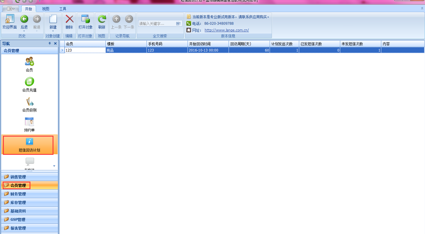 傲藍(lán)眼鏡店管理軟件在會員管理里,有個短信回訪計劃,可以讓門店提前設(shè)后要回訪的時間,回訪的會員,回訪的內(nèi)容,不會漏掉一個客戶沒有回訪的,讓客戶覺得很貼心,服務(wù)很周到的感覺。
